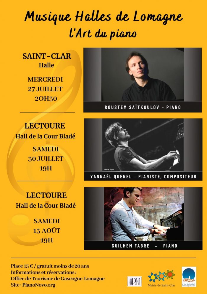 Musique Halles de Lomagne 2022 Mercredi 27 juilletRécital de piano : Roustem SaïtkoulovInformations Samedi 30 juilletRécital de piano & compositions : Yannaël QuenelInformations Samedi 13 aoûtRécital de piano : Guilhem FabreInformations